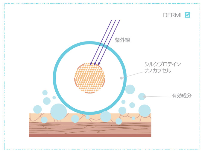 独自のUVカット技術シルクプロテイン ナノカプセルを採用し、紫外線吸収剤を包み込みます。 紫外線からあなたのお肌を効果的に守り、また直接お肌に紫外線吸収剤が触れることがないので、アレルギーや湿疹などのお肌症状の方にも、安心してご使用いただけます。